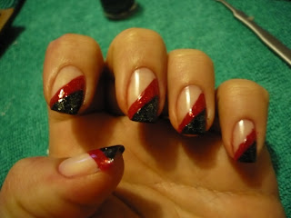 Per questa versione i prodotti usati sono gli stessi,ma sul pollice e sul medio ho fatto una french rossa poi con il tip painter nero ho disegnato un triangolo e degli sbaffi,all'interno di questi ho messo un po' di glitter rosso disegnando con bianco e rosso dei pallini.